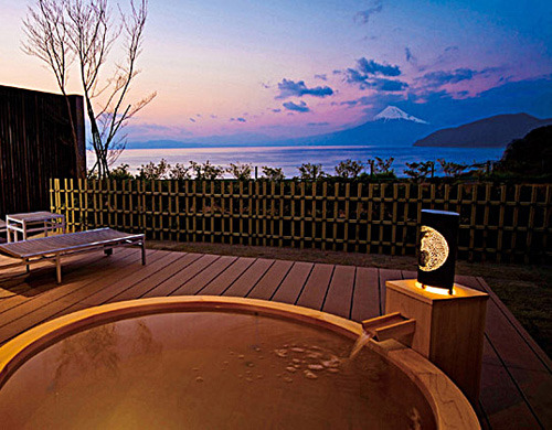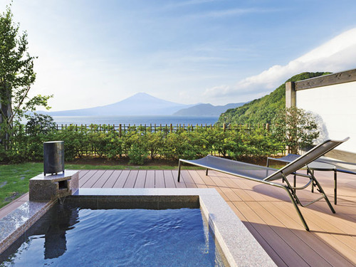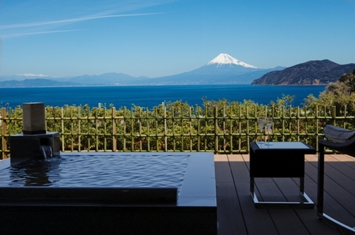 - □西伊豆土肥。世界遺産の富士山を臨む海に全室露天風呂付客室の宿。