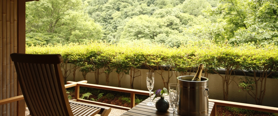 □目の前に広がる緑の海原。移り行く渓谷が心を解きほぐす山峡の湯宿。