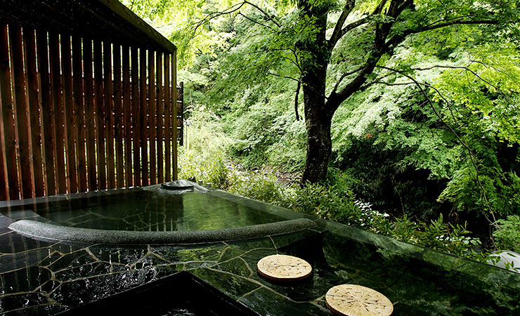 奥湯河原 結唯 -YUI-は5部屋のみ、滝を望む客室と沐浴が楽しめる最上階の大浴場が人気。