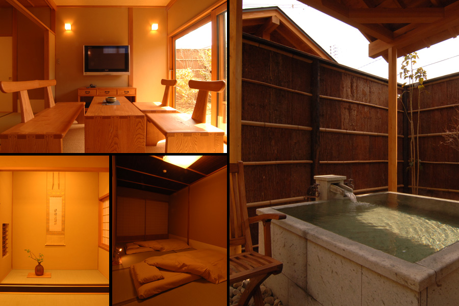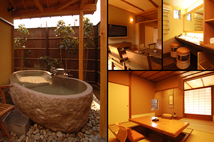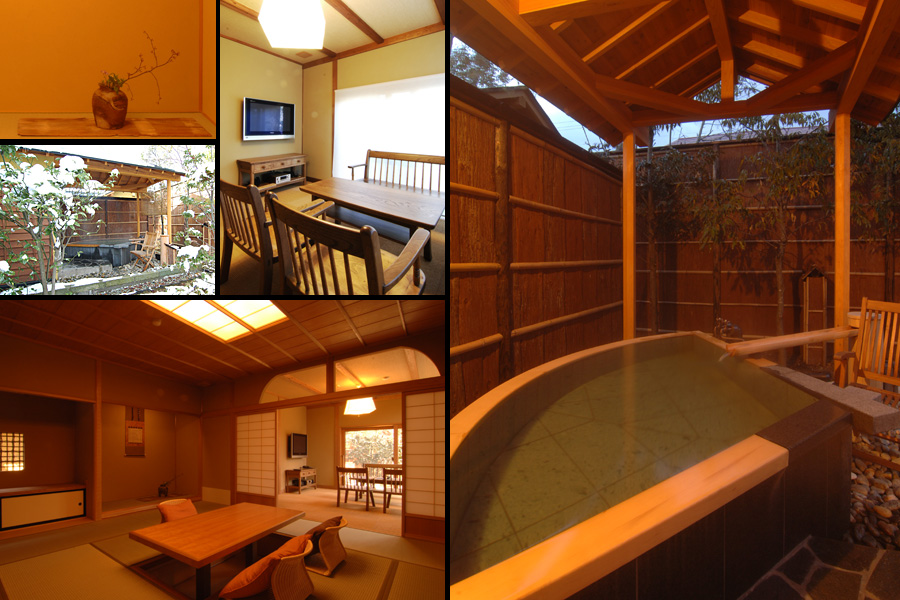 - □主室+寝室+リビング+専用露天風呂+渡り廊下+パウダールームという広々とした客室。