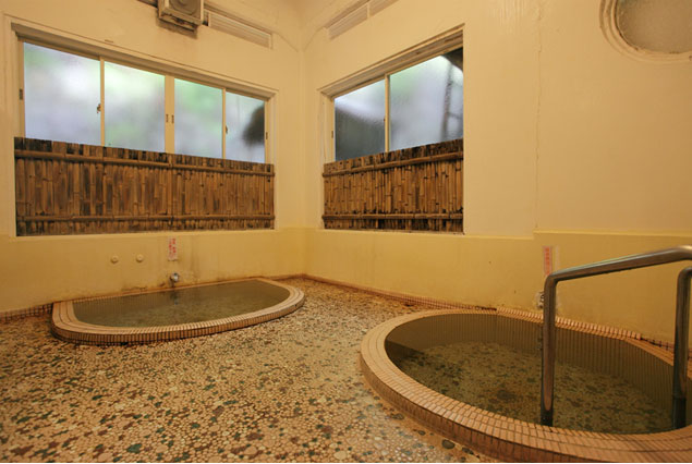 □五つの湯船と、源泉の蒸気による二つの蒸し風呂。